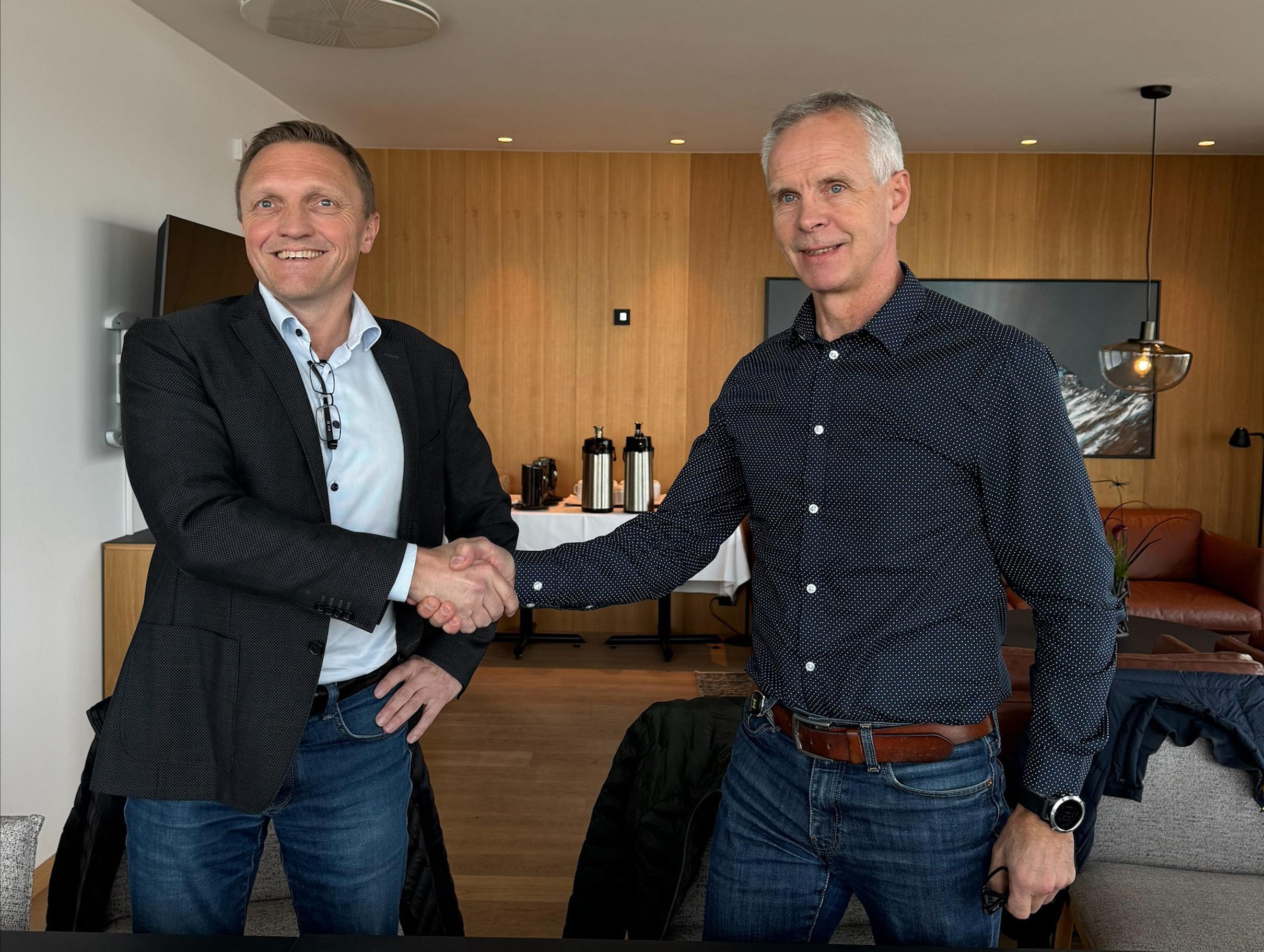 Helge Rysjedal i Eviny Solutions (t.v) og Arve Hovdenak i Linja er godt fornøyd med den nye kontrakten (Foto: Eviny Solutions)