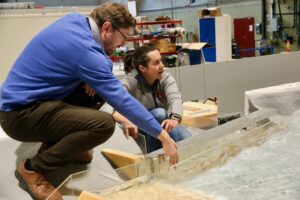 Geir Helge Kiplesund forteller at forsøkene i den fysiske modellen i laboratoriet gjør det mulig å etterprøve resultatene av de numeriske simuleringene.