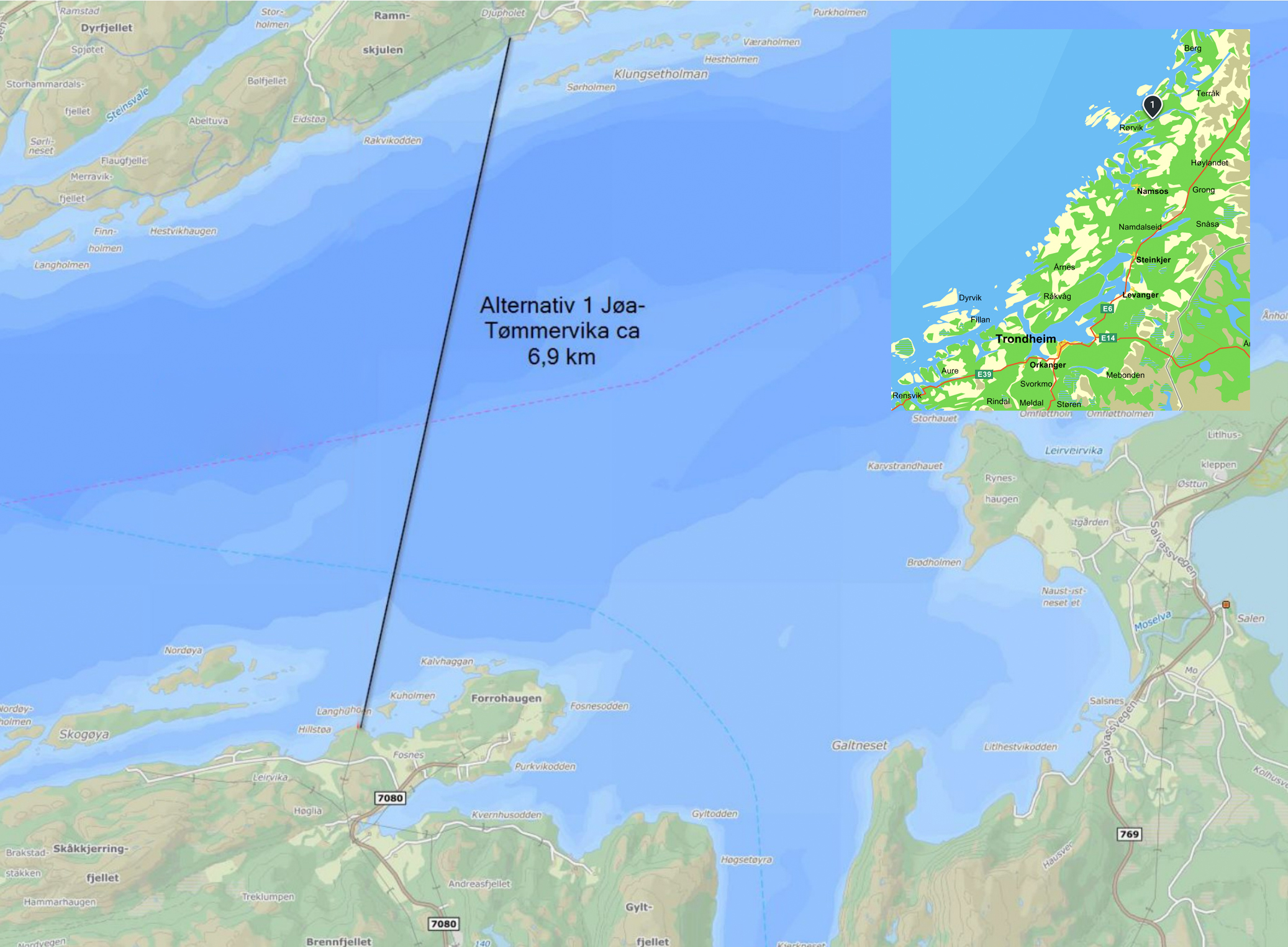 Den nye sjøkabeen skal legges over Foldafjorden mellom Tømmervika på Abelvær til Jøa. (Ill: NVE/AA)