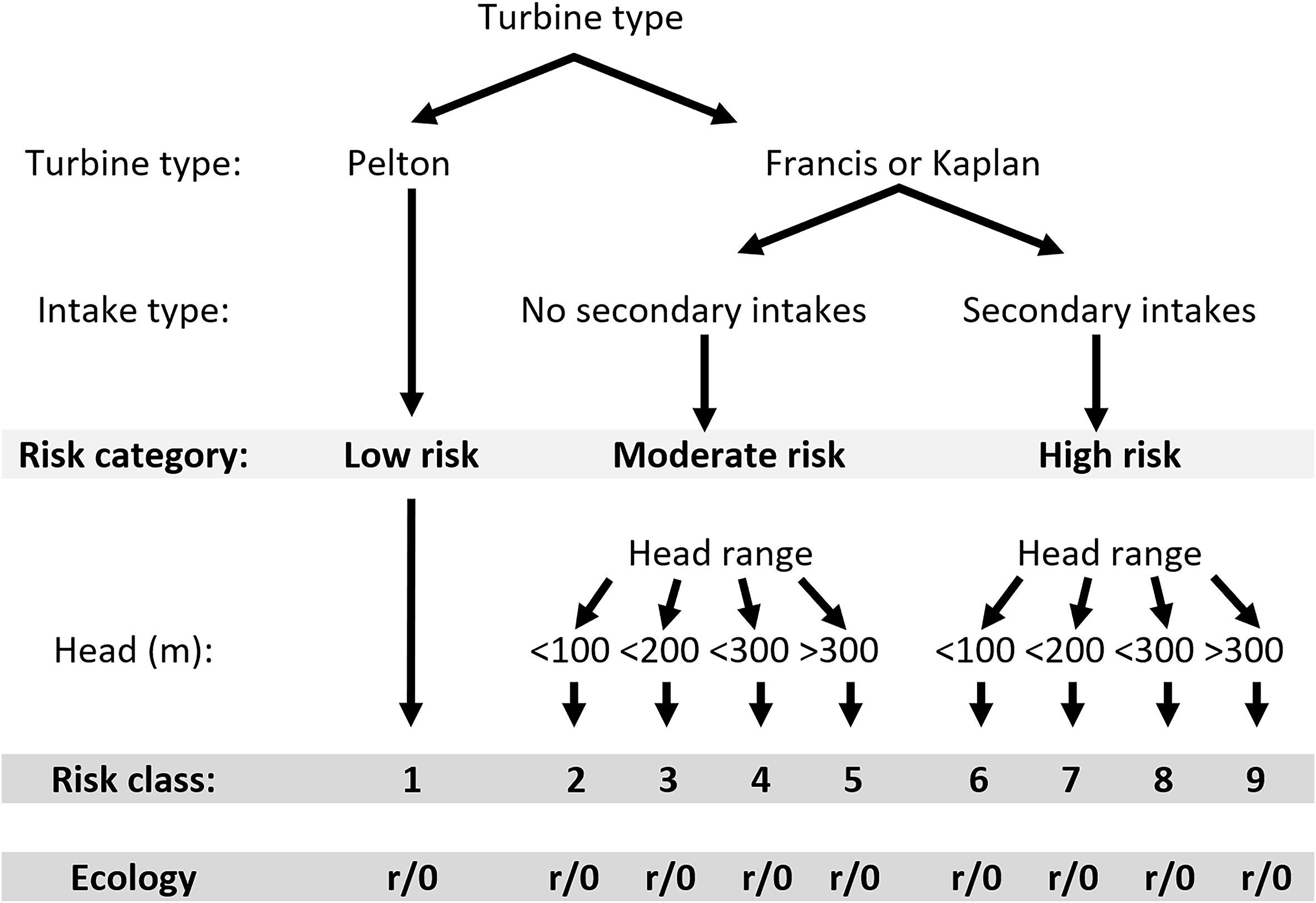 Forskerne har utviklet en modell for risikoanalyse ved kraftverk, som tar utgangspunktet i hvilken turbintype kraftverket benytter (se grafikk under). Ved bruk av denne, har de klassifisert risikoen på en skala fra én til ti.