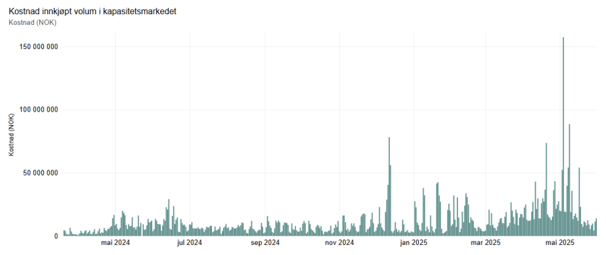 Dette var imidlertid bare forsmaken på hva som skulle skje. Månedlige totale kostnader for innkjøpt volum i kapasitetsmarkedet for mFRR har siden årsskiftet fortsatt å stige, og i april og mai gikk prisene til himmels, går det fram i en rapport Statnett offentliggjorde mandag.