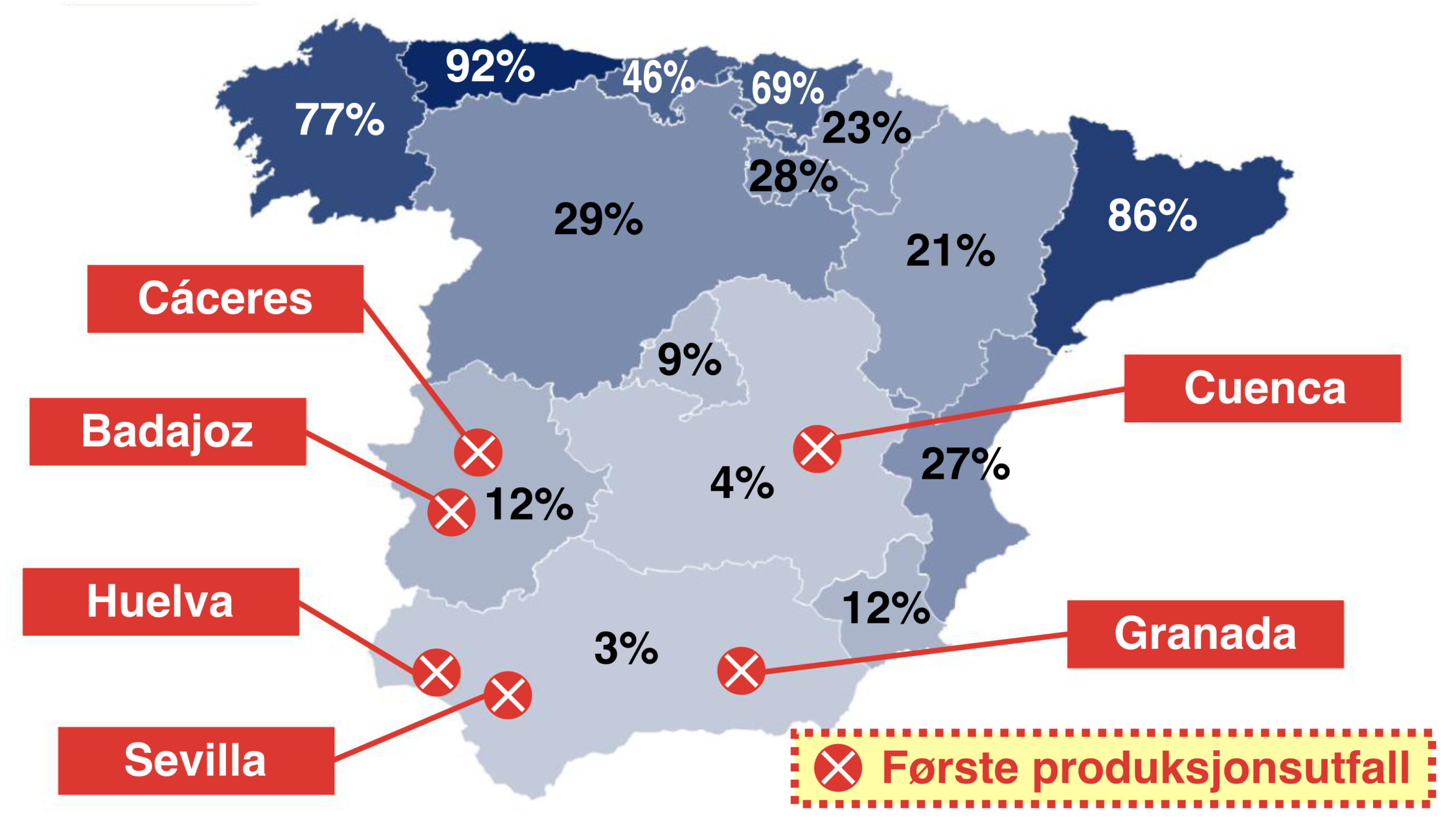 Som illustrert i figuren under, oppsto de første produksjonstapene som utløste strømbruddet i områder av Spania med lavest andel synkron kraftproduksjon. Altså der det var lite bidrag fra vannkraft, kjernekraft og gasskraft. Dette er et ganske nytt fenomen.