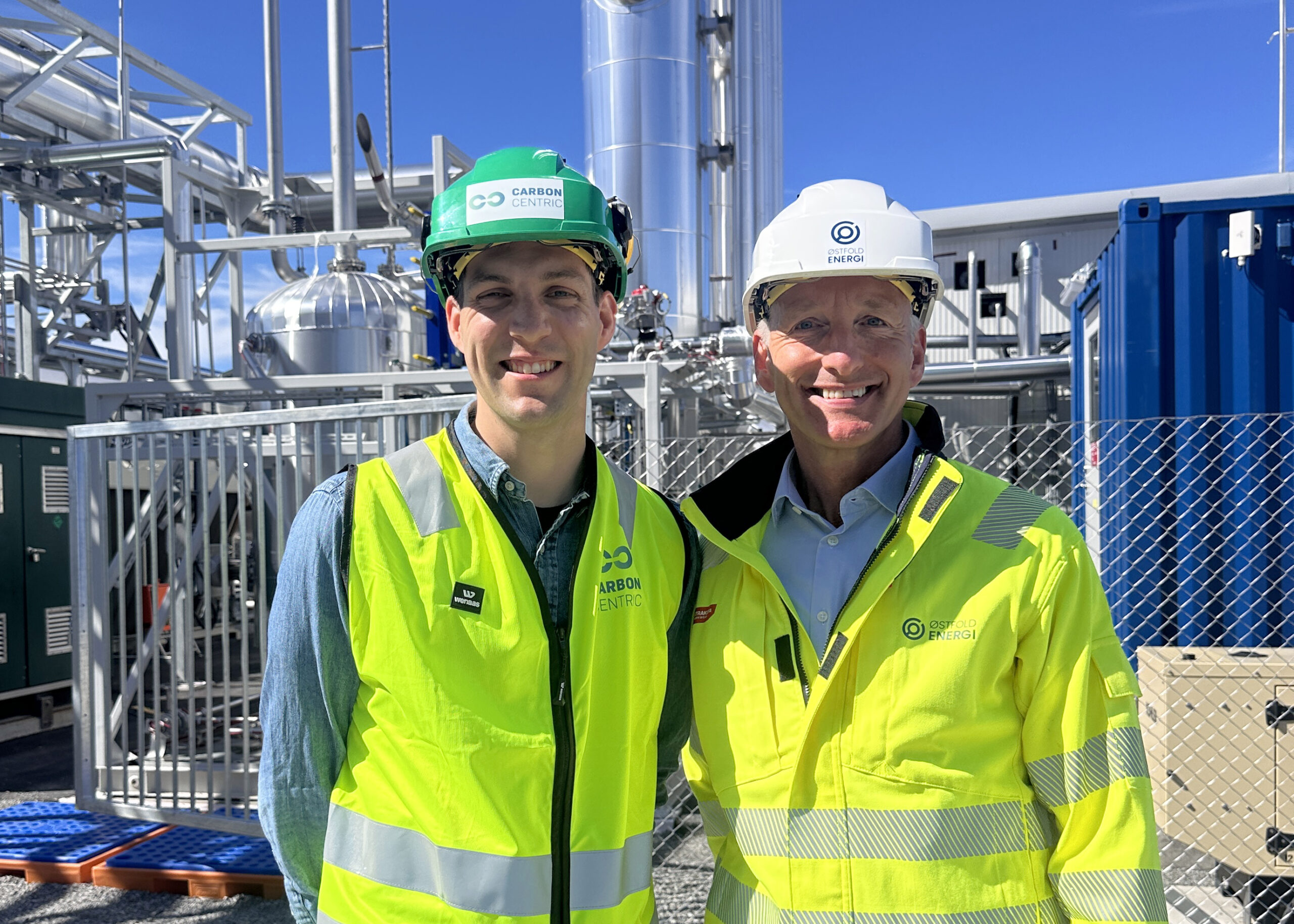 Klimaminister Andreas Bjelland Eriksen (Ap) og administrerende direktør Oddmund Kroken i Østfold Energ ved karbonfangstanlegget i Rakkestad. (Foto: Østfold Energi)