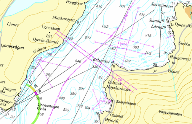 Statnetts nye spenn over Hardangerfjorden må ifølge Kystverket være 75 meter høyt for at cruiseskip ikke skal krasje, til tross for at det ifølge Statnett gir svekket forsyningssikkerhet. (Kart: Kystverket)
