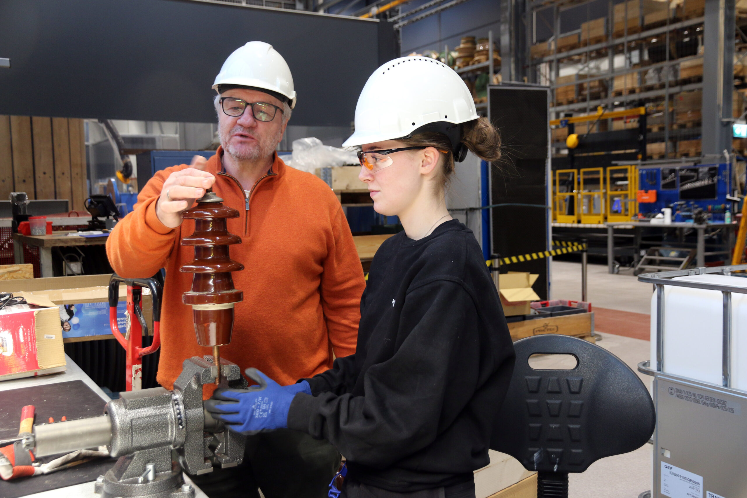 Rutinerte Børre Hansen viser Tiril Sofie Lønberg hvordan ting skal gjøres i Hitachi Energys trafoverksted i Drammen. (Foto: Trygve Tomren-Berg)