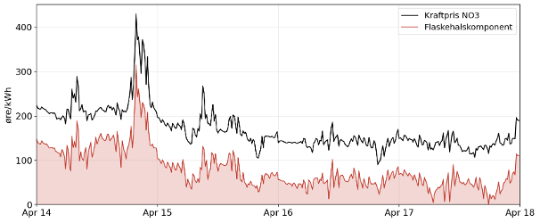 Senere tids prisdannelse i NO3 viser at en flaskehals internt i budområdet gir opphav til økte priser, samtidig som høy produksjon av vindkraft i det samme budområdet (Fosen) ytterligere bidrar til å stramme flaskehalsen.