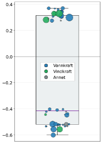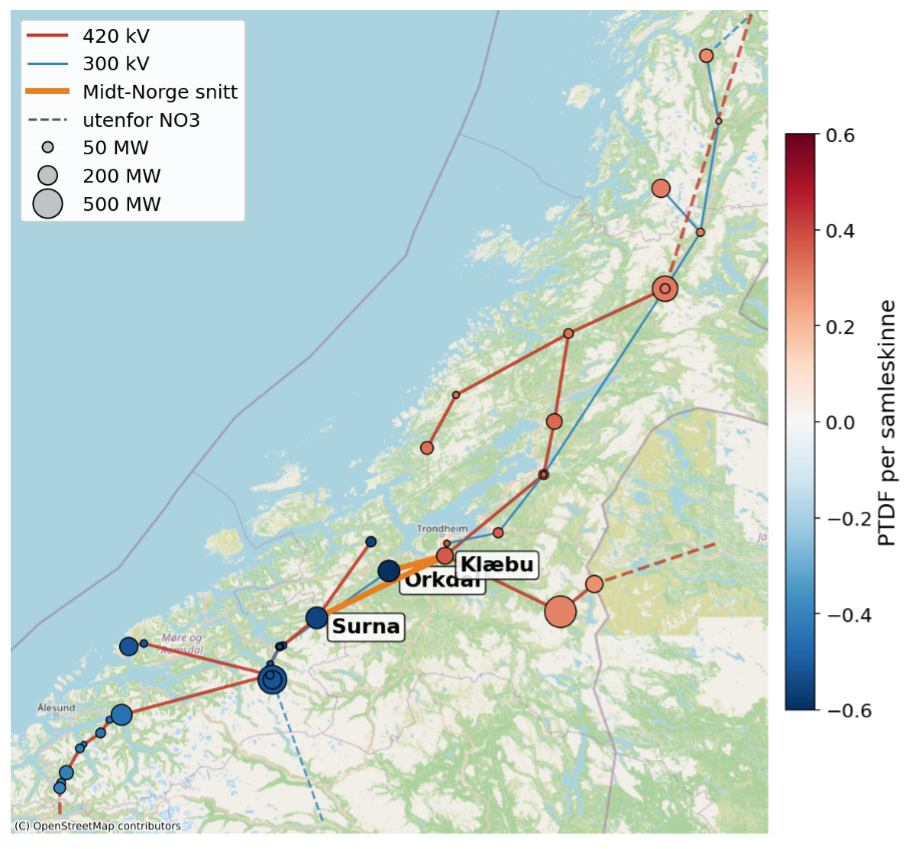I Figur 2 vises fordeling av PTDFer på samleskinnenivå for Midt-Norge snitt, som består av linjene Klæbu–Surna og Klaebu-Orkdal, basert på et pyPSA-datasett. Dette datasettet er åpent tilgjengelig og gir en god tilnærming til det reelle systemet.