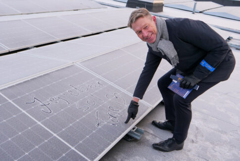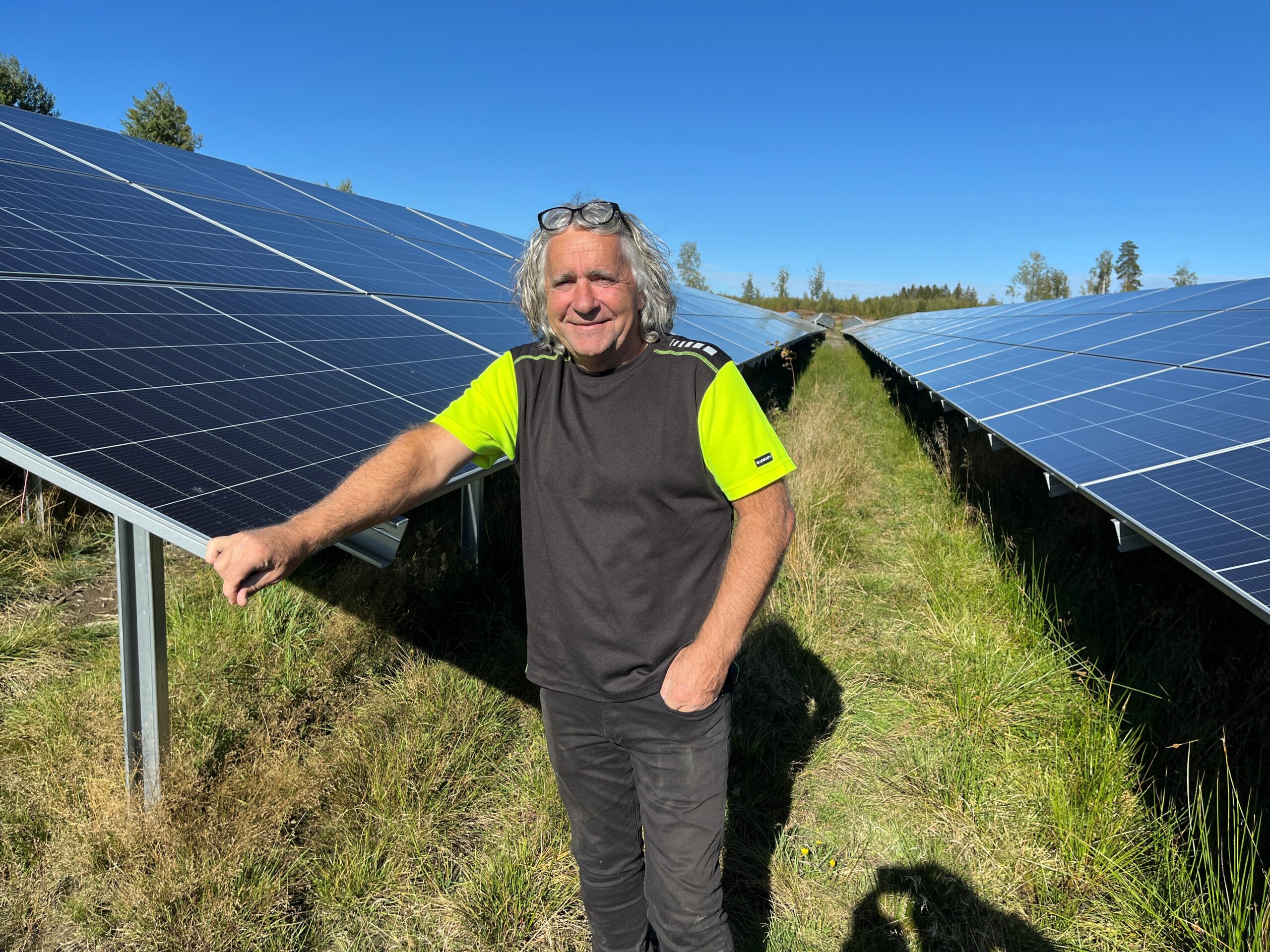 Eier av Hydropower AS, Ove Helgesen, foran Vikersund solkraftverk i Modum kommune. (Foto: Ronny Blekkan/Bygdeposten)