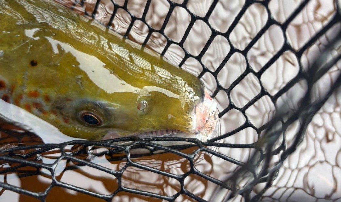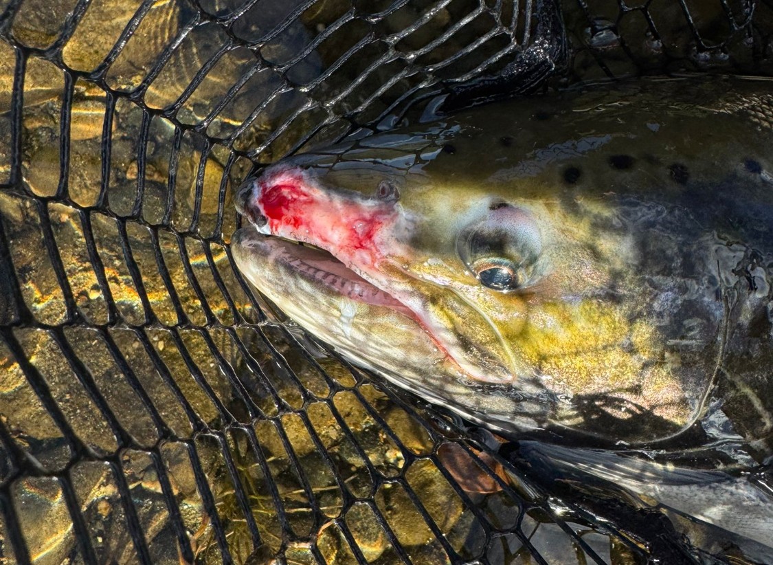 Dette er en av to laksene med snuteskade som NINA fisket ved Nedre Fiskumfoss i 2025. (Foto: NINA)