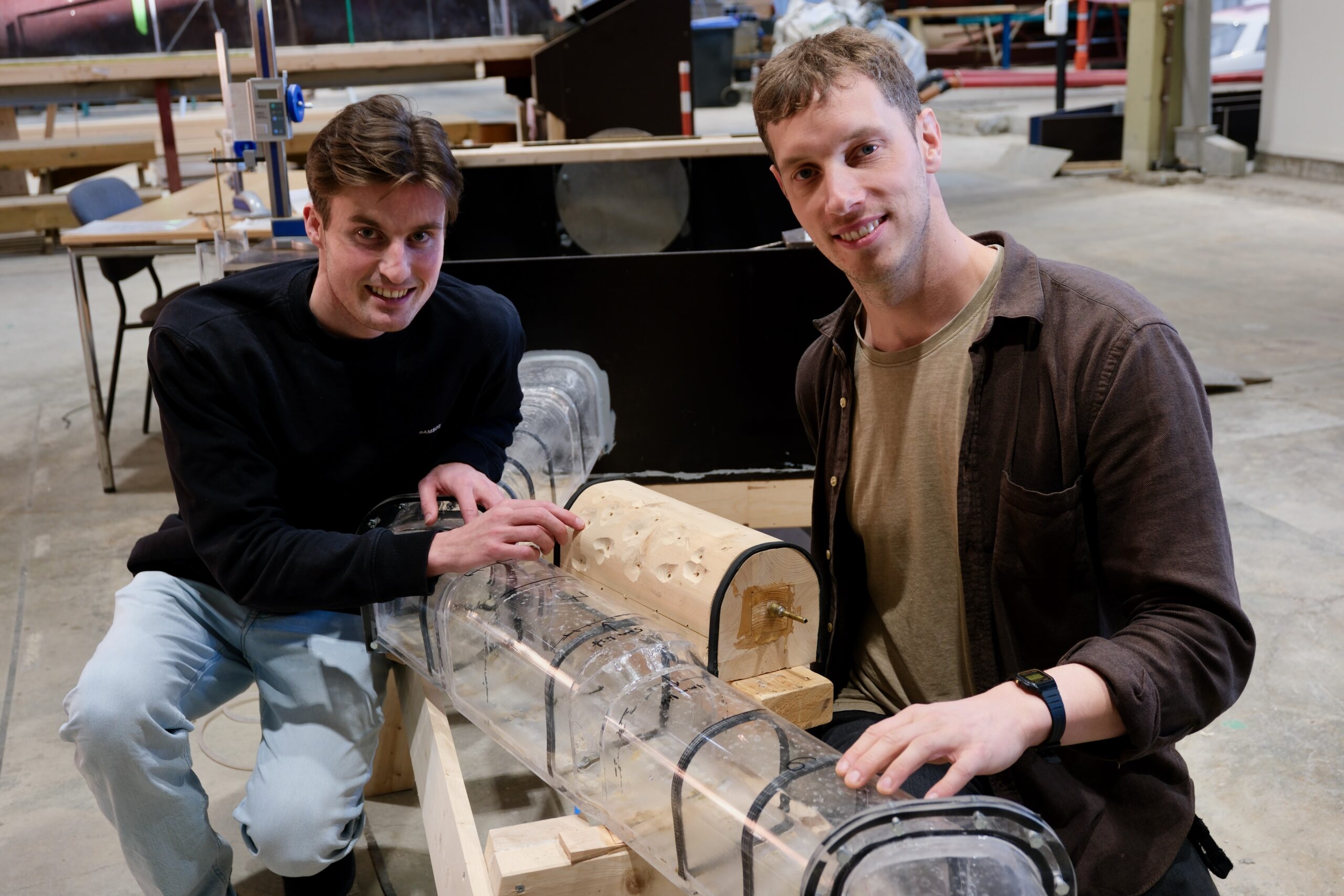 Materstudent Sondre Solvang Jensen (t.v) og forsker Nils Solheim Smith ved et tunnelsegment til den utførte modellen. (Foto: Stein Arne Bakken)