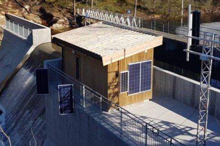 Miljø og bærekraft var viktig da Agder Energi Vannkraft skulle ha ny fjernstyring på dam Sandvatn i Fedavassdraget. Nå sørger fire solcellepaneler og to små vindturbiner for strøm nok til å kjøre tappeluka i den nye dammen.