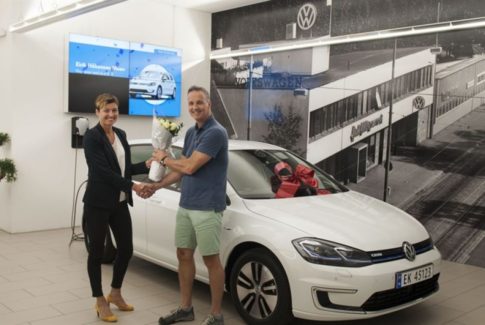 Eirik Moen har fått overlevert en splitter ny Volkswagen eGolf av Hafslund Nett. Moen er den første vinneren i Hafslund Netts utlodning av to elbiler blant kunder som har fått ny automatisk strømmåler.