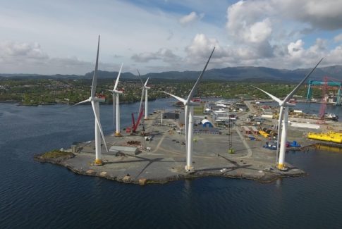 De tre første vindturbinene er nå montert på det flytende fundamentet på Stord, klart for tauing til verdens første flytende vindpark utenfor skotskekysten. Alle fem skal på plass i løpet av juli.